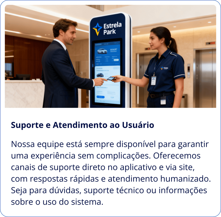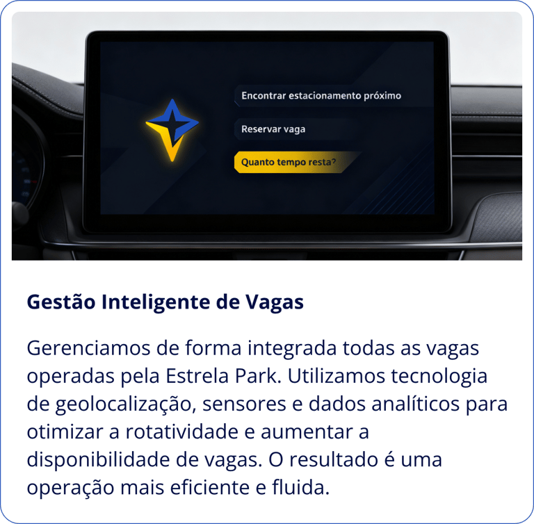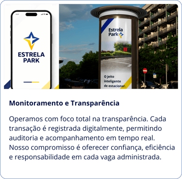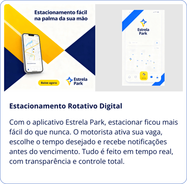 Na Estrela Park, tecnologia e praticidade caminham juntas. Com um aplicativo exclusivo, criamos uma experiência de estacionamento simples, segura e 100% digital. Nosso sistema permite que o motorista encontre, ative e renove seu tempo de permanência com poucos toques, sem precisar sair do carro. Além disso, oferecemos soluções completas para gestão de vagas, monitoramento e suporte, garantindo eficiência tanto para o usuário quanto para o poder público.